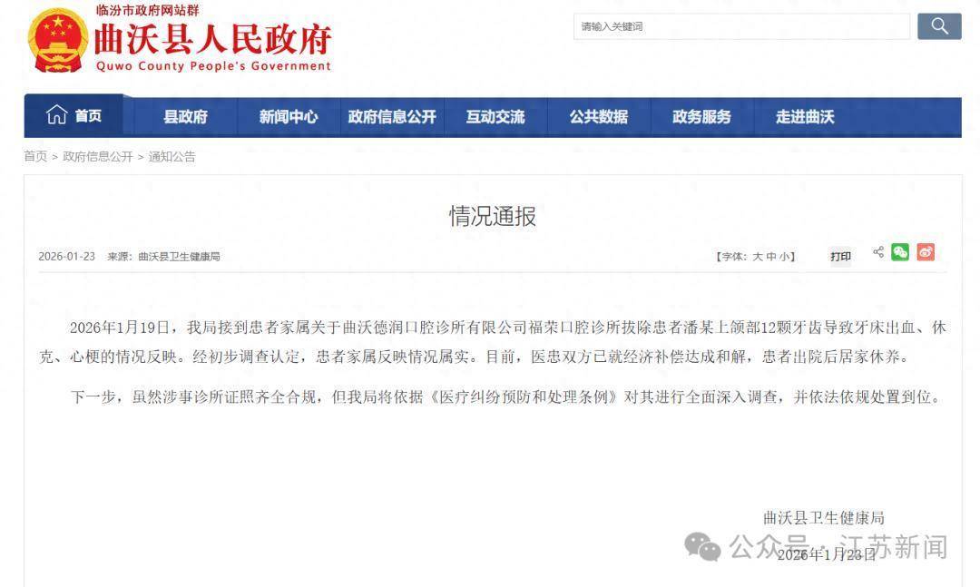 2026年1月19日,我局接到患者家属对于曲沃德润口腔诊悉数限公司福荣口腔诊所撤消患者潘某上颌部12颗牙齿导致牙根出血、休克、心梗的情况响应。经初步拜谒认定,患者家属响应情况属实。现时,医患两边已就经济补偿完了息争,患者出院后居家疗养。