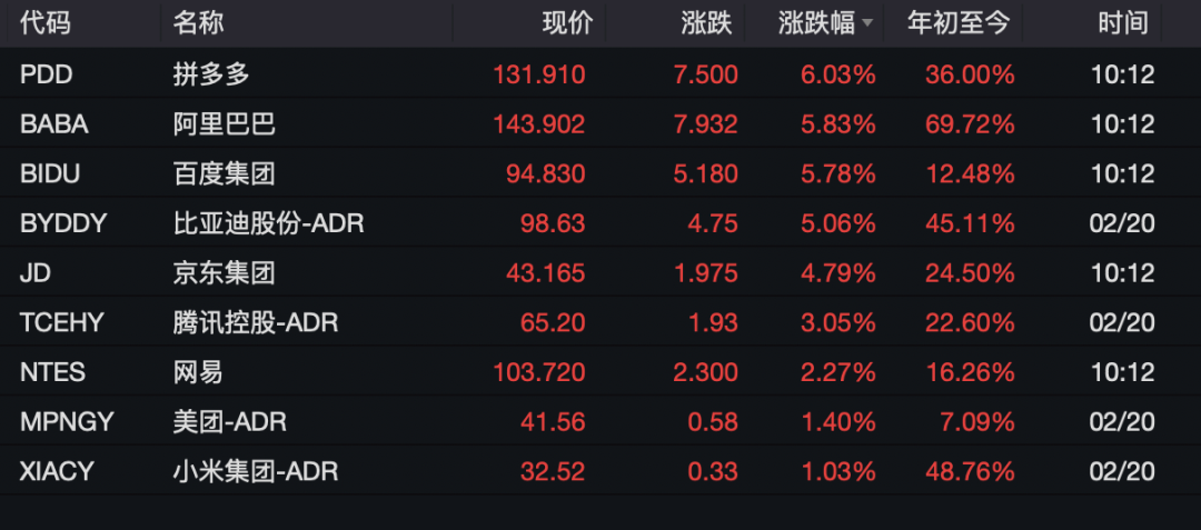 具体个股方面,中概龙头科技股中,拼多多涨超6%,百度集团、阿里巴巴涨超5%,京东集团涨超4%,网易涨超2%。