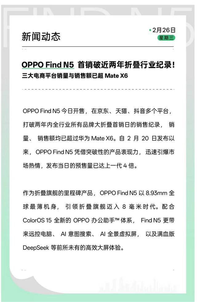 有一说一MK体育(中国)官方网站,OPPO Find N5首销工夫东谈主气确乎很高,从OPPO给出的数据来看,这款大折叠机型径直在多个电商平台冲突了近两年通盘品牌大折叠首销日的销售记载,以至在销量和销售额两个方面均已卓著Mate X6。有这样亮眼的得益,OPPO新品确乎剖判出色。