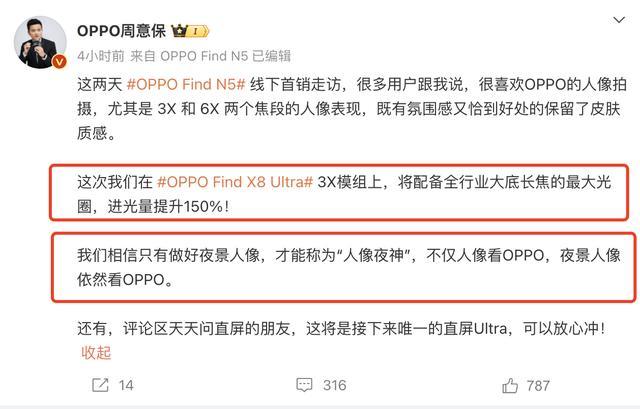 值得正式的是,OPPO Find X8系列的Ultra版块,将很快跟咱们碰头,从网上给到的爆料信息来看,OPPO Find X8 Ultra将对双潜望镜头进行升级,3X潜望是全新模组,浮动镜组,物理长焦微距齐安排上了!光圈亦然通盘Ultra机型里最大的,可能还会有全球最窄的边框,看来OPPO此次是果真憋了一个大招。