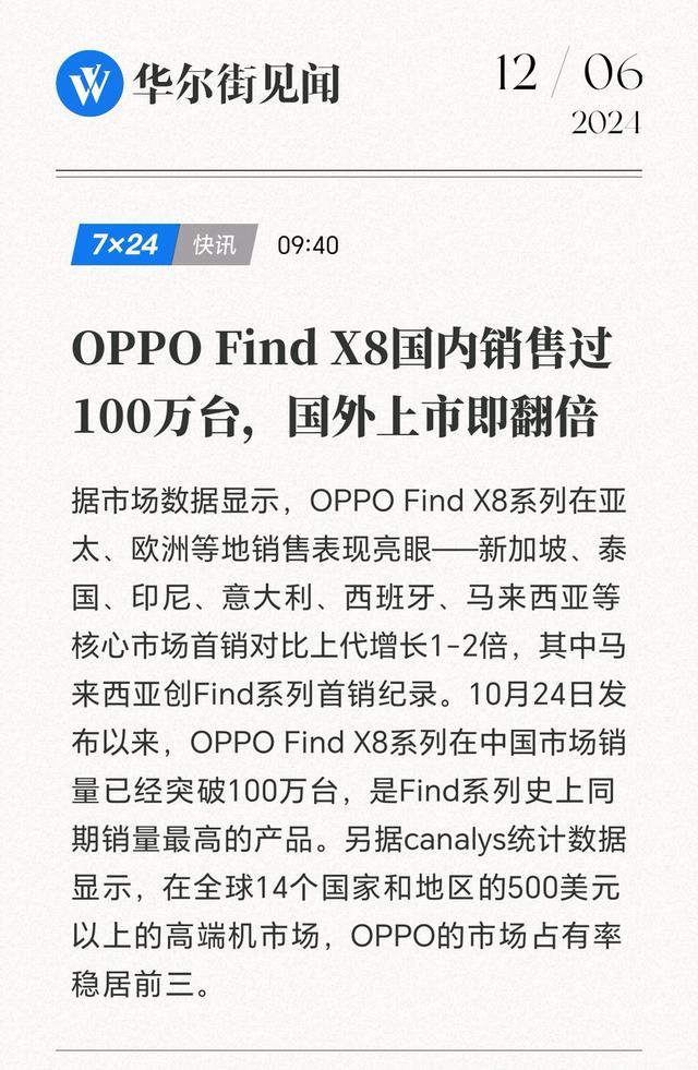 各类迹象标明,OPPO Find X8系列正在成为三星和苹果顶级旗舰除外的另一种采选。由于Find X8系列的出现,OPPO在第四季度600好意思元以上高端市集的出货量同比增长32%,市集份额快速增长。国补后OPPO Find X8系列的增长幅度也历害常夸张,OPPO广州正佳广场旗舰店战略奏效四小时即成交45台旗舰机型,Find X8系列占比达七成。
