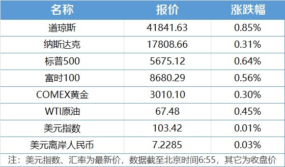 1、好意思国三大股指全线收涨,说念指涨0.85%报41841.63点,标普500指数涨0.64%报5675.12点,纳指涨0.31%报17808.66点。耐克涨超2%,沃尔玛涨逾2%,领涨说念指。特斯拉跌超4%,英伟达跌逾1%。中概股多数上升,小牛电动涨超29%,百度集团涨逾9%。
