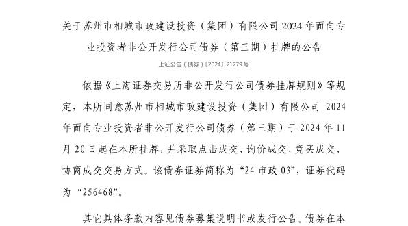 11月19日,上交所发布对于苏州市相城市政诞生投资(集团)有限公司2024年面向专科投资者非公设备行公司债券(第三期)挂牌的公告。