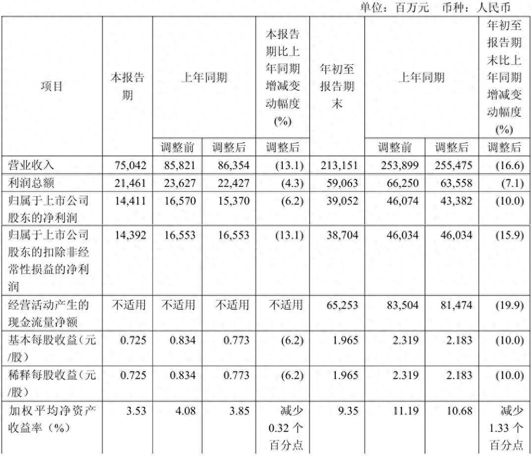 吉祥银行(000001.SZ)公告称,第三季度营收为312.83亿元,同比下落9.2%;净利润为134.69亿元,同比下落2.8%。前三季度营收为1006.68亿元,同比下落9.8%;净利润为383.39亿元,同比下落3.5%。
